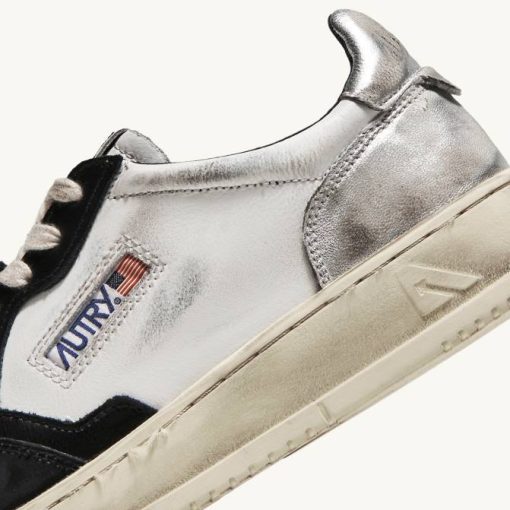 medalha autry exclusiva em couro branco, prateado e preto com efeito desgastado; feito à mão por mestres artesãos usando tratamentos inovadores. autry super vintage é o resultado de uma combinação de elementos e customizações que tornam o produto único e exclusivo, obtido através de processos concebidos e executados na itália.inspirados nos icônicos tênis dos anos 80, esses tênis medalhistas em couro vêm com efeito desgastado feitos à mão por mestres artesãos através de vários tratamentos inovadores. autry super vintage é o resultado de uma combinação de elementos e customizações que tornam o produto único e exclusivo, obtido através de processos concebidos e executados em caderno de encargos: cabedal efeito usado em couro branco, prateado e preto com costuras definindo o formato do inserções multicamadas contrastantes. biqueira perfurada para melhor respirabilidade. cadarços planos parcialmente encerados com efeito usado em algodão. etiqueta tonal super vintage costurada em uma língua de couro. gola acolchoada no tornozelo com interior contrastante.icpatch ônico prateado nas costas com logotipo em relevo. forro em couro e algodão felpudo. palmilha de 2 cm de altura em couro. solado em borracha de efeito usado com logotipo. altura da sola: 2,5-3,5 cm. bolsa de sapato incluída. bolsa de sapato incluída.