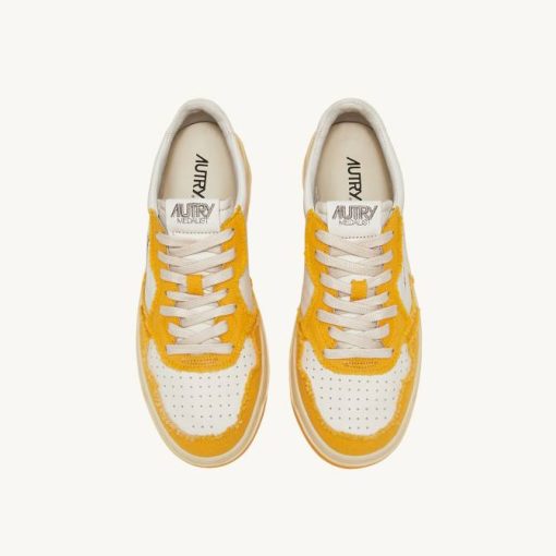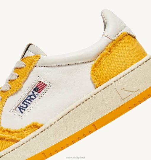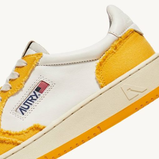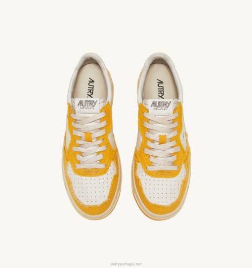 estilo atemporal: o medalhista autry é inspirado no design vintage dos anos 80, reinterpretado em uma chave moderna. um design distinto feito único pela parte superior em pele de cabra macia e lona desgastada cor de manga com o logotipo icônico em relevo em um patch branco nas costas. Tênis de cano baixo estilo vintage dos anos 80 para homens. especificações: cabedal em pele de cabra branca macia e lona desfiada cor de manga biqueira perfurada para melhor respirabilidade. cadarços planos de algodão. etiqueta tonal costurada em uma língua têxtil. gola acolchoada no tornozelo. icônico patch branco nas costas com logotipo em relevo. couro e forro de algodão felpudo. 2 cm- palmilha alta levantada em couro. sola de borracha a combinar com a cor do logótipo. altura da sola: 2,5-3,5 cm. Bolsa para sapatos incluída.